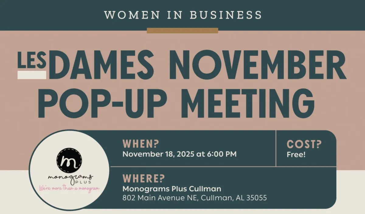 Join us for a special evening of connection, conversation, and community support as we gather for a quick membership update, followed by a spotlight on the incredible woman behind Monogram's Plus Cullman. Proudly woman-owned since 1999, Lynsey Todd has curated your go-to spot for gifts, style, and Southern charm in Cullman.