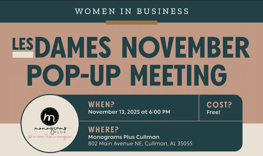 Join us for a special evening of connection, conversation, and community support as we gather for a quick membership update, followed by a spotlight on the incredible woman behind Monogram's Plus Cullman. Proudly woman-owned since 1999, Lynsey Todd has curated your go-to spot for gifts, style, and Southern charm in Cullman.